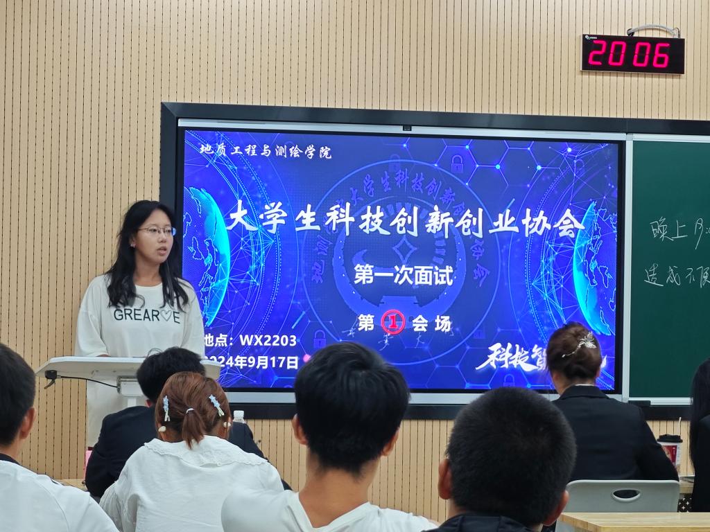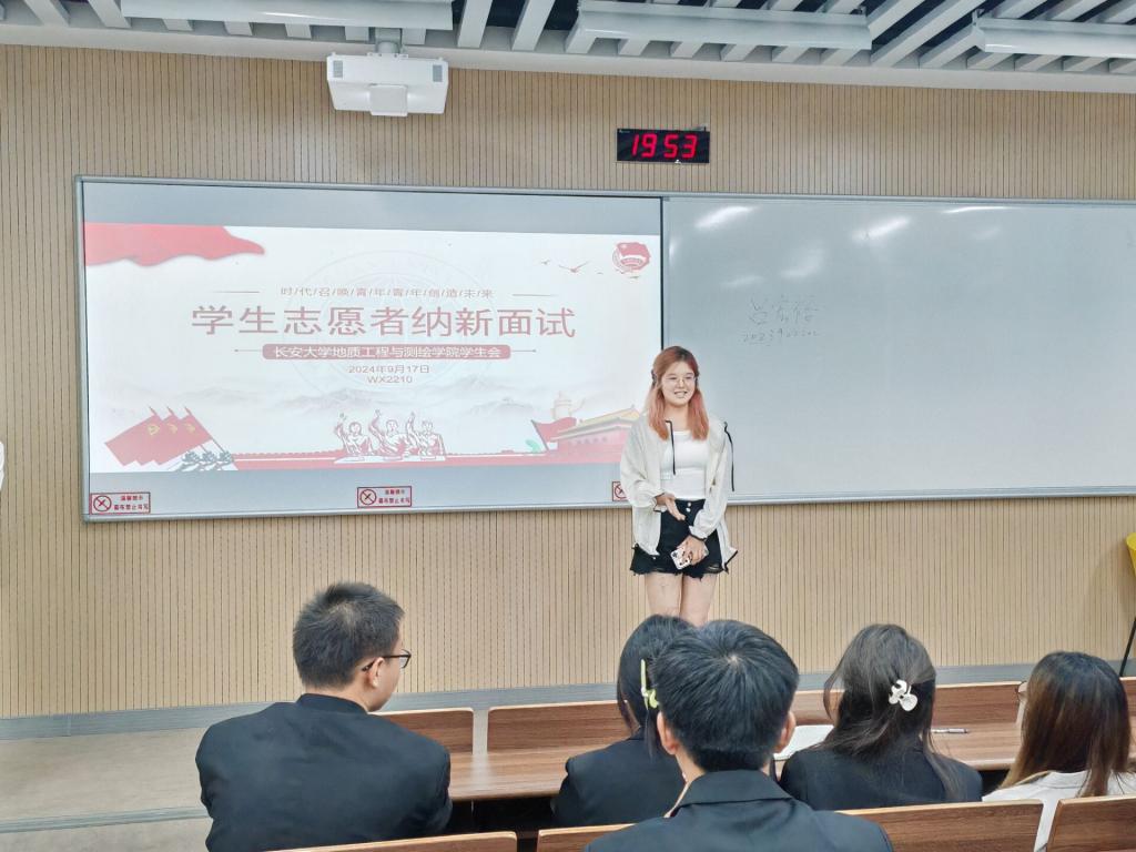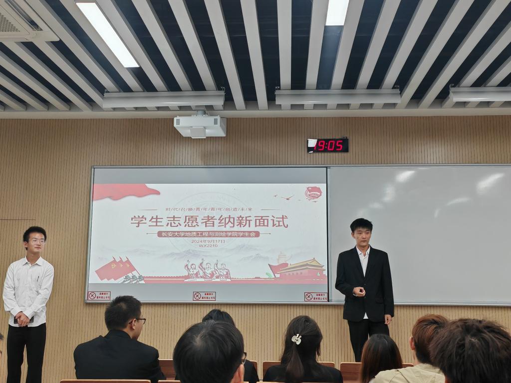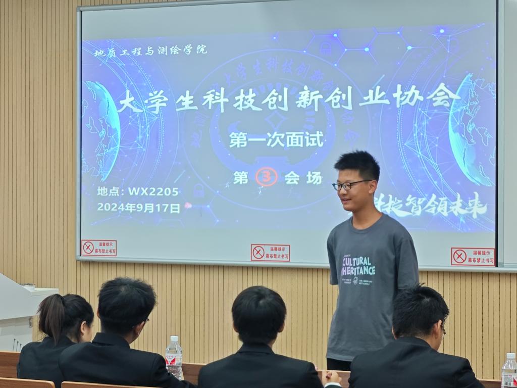 面试现场,参选同学依次进行自我介绍,面试官们紧扣介绍内容深入提问。同学们应答从容,态度认真,言语间尽显昂扬精神风貌与积极表现的决心。