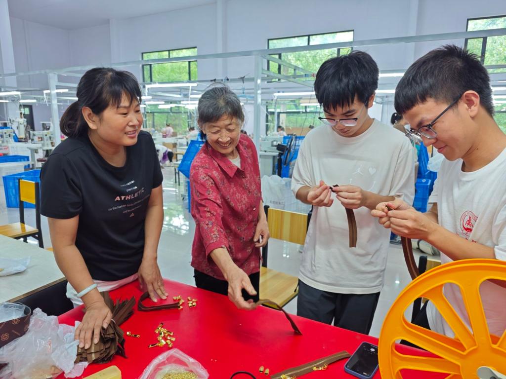 为进一步了解村企发展,实践队员进入店房村美悦箱包加工厂有限公司加工点进行调研学习。通过与厂区负责人交谈了解到,车间技术要求不高,简单易学,村民走到家对面就可以工作,既能补贴家用又为村集体经济增收。工厂现有本村务工人员50名,外来务工人员2名。当前,阜平县手工业加工点共计41个,现有就业工人1100多人,人均月增收5000元。在工人的指导下,实践队员亲自上手操作,亲身体验了箱包加工过程。亲身体验后,实践队员的实践能力的得到提高,对劳动实践意义有了更深刻的认识。经了解,阜平县坚持党建引领乡村振兴,以拓宽就业渠道、增加群众收入为重点,结合全县六大富民产业,挂实招商引资“加速档”,科学统筹推进家庭手工行业在乡村振兴中持续发挥作用。