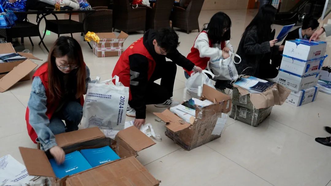 志愿者正在准备大会物资