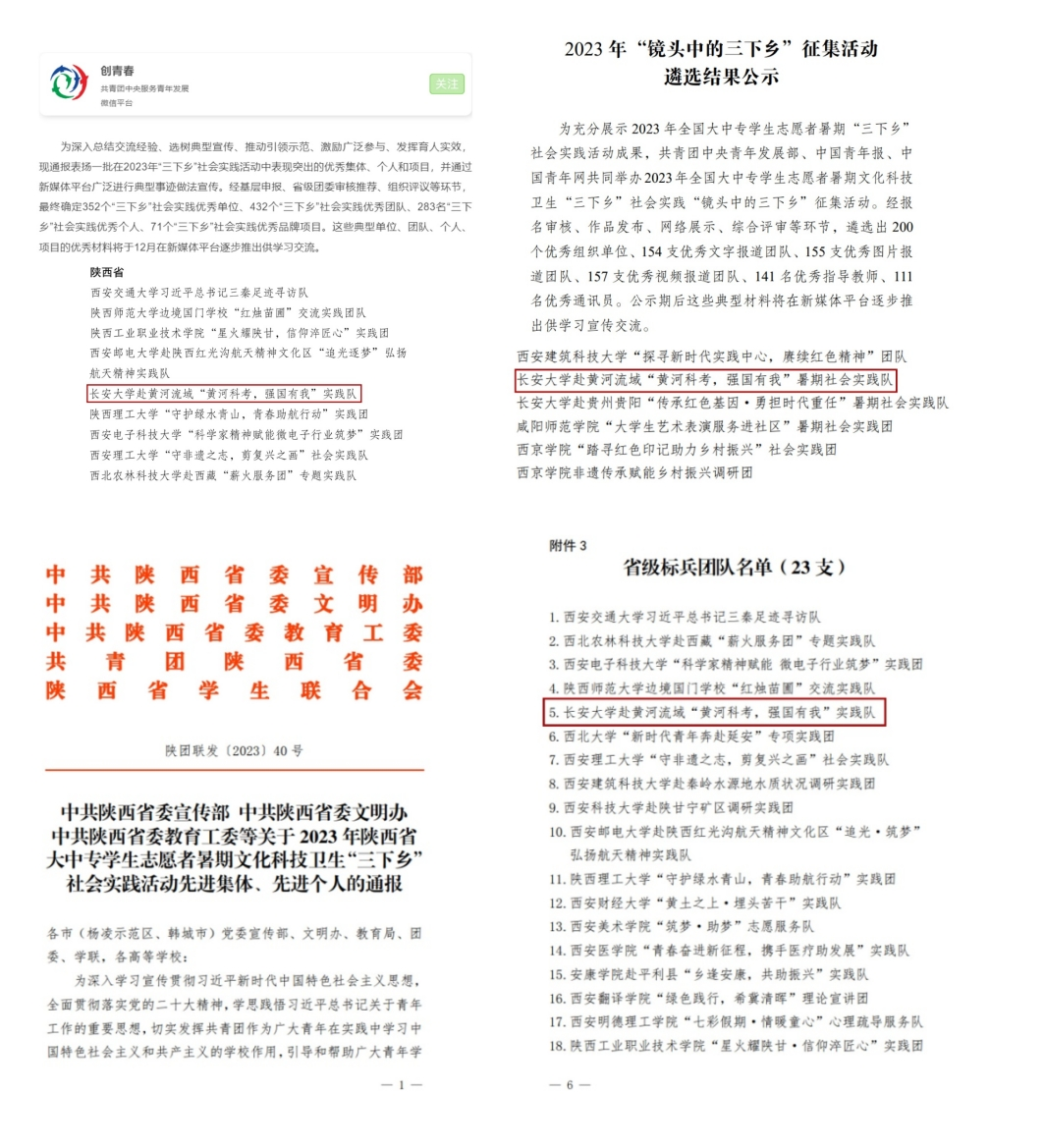 赴黄河流域“黄河科考,强国有我”实践队荣获2023年社会实践“全国优秀团队”、“省级标兵团队”、镜头中的三下乡“优秀文字团队”荣誉称号。