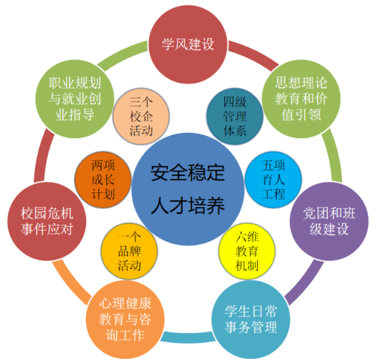 学生教育与管理工作在院党委的领导下,坚持以立德树人为根本任务,以学生为中心,全员全过程全方位育人,不断落实主体责任,扎实推进学生工作,逐步形成“一心双环、六项重点、七大职责”工作构架。