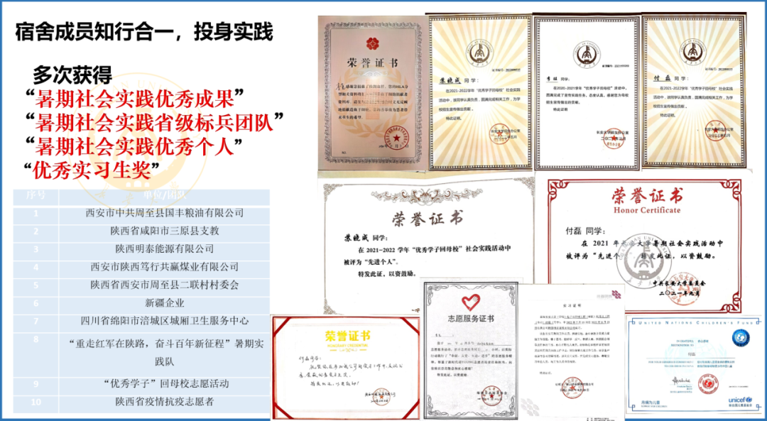春生夏长,秋收冬藏。经过大学四年的沉淀,宿舍四人在个人素养和综合素质方面取得了优异的成果,宿舍三人获得专业推免资格,宿舍成员累计奖项及荣誉称号共100余项。宿舍所获奖学金累计4.5万余元,科创经费1万余元。