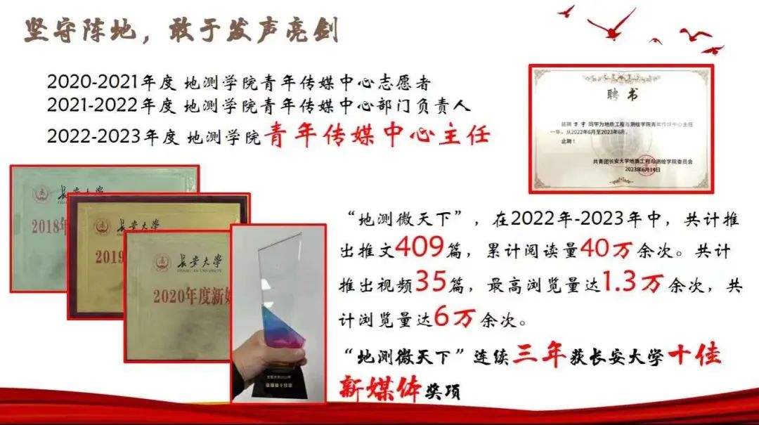青年传媒中心的主任。运营的学院官方公众号“地测微天下”,在2022年-2023年中,共计推出409篇,内容涵盖了各类活动新闻稿、公示以及相关重大时间节点原创推送,组织推出了《青春践行党的二十大、爱校奋进新征程》、《地“道”乐谈》、《录取通知书接力》等系列推送,累计阅读量40万余次;目前,已累计7174人关注公众号,常读人数2000余人。地测微天下连续三年获取做爱视频