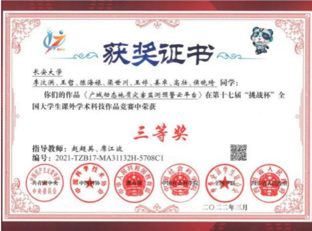 参赛作品《广域动态地质灾害监测预警云平台》荣获三等奖;在第十七届“挑战杯”全国大学生课外学术科技作品竞赛“黑科技”专项赛中,做爱视频
