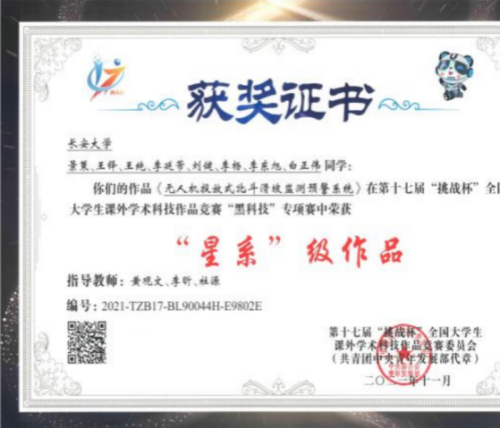 景策等同学的作品《无人机投放式北斗滑坡监测预警系统》获“星系”级作品(特等奖)。在第十一届“挑战杯”陕汽集团陕西省大学生创业计划竞赛中获得金奖、银奖各1项;在第十三届“挑战杯”中国大学生创业竞赛决赛中,《“北斗地哨”——地质灾害隐患识别与监测预警响应系统团队》的作品团队荣获三等奖。