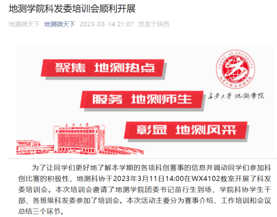 除此之外,地测科协在创新创业相关领域的活动宣传方面也做到了全方位、全阶段、全范围。对校内外的创新创业活动、科创赛事均有宣传,收集了来自校内各年级的创新创业计划,积极开展了专业介绍、赛事讲解、学科发展等活动;各种宣传贯穿各项活动、赛事所有阶段;宣传对象面向各年级同学。在这样的体系下,地测科协在宣传方面取得了显著的成效。
