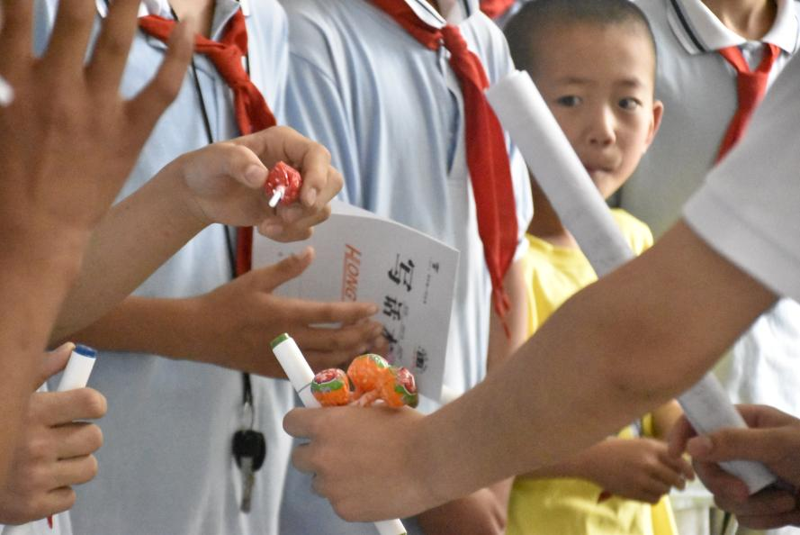 图为讲解员为同学们发放小奖品