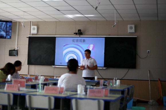 经过一系列的精心准备后,趣味实验课堂于7月18日正式开讲。在正式授课环节,台上留有一名队员担任主讲工作,台下留有辅助人员。在队员们的耐心讲解与引导下,同学们不再拘谨,开始争先恐后的抢答问题,整个实验现场其乐融融!