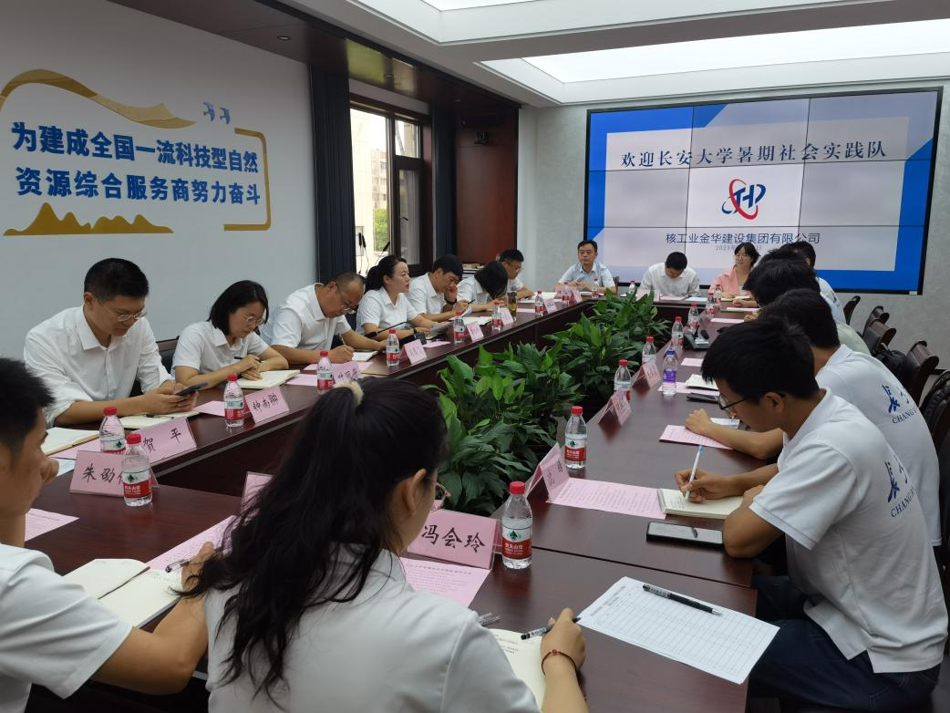 在工作人员的带领下,实践队成员抵达核金建设集团会议室,与核金集团董事李旭卿、集团党委委员刘炎良、集团副总工程师冯雁飞等领导进行了深度的座谈交流。