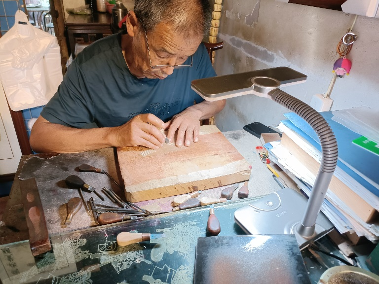 图一 张师傅专心制作皮影
