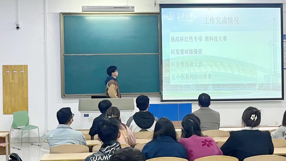 紧接着,常建东主席从五四评优、五小创、运动会三项工作总结着手,鼓励科协成员们积极参与各项科创比赛,在学院内起到带头作用,引领积极的科创风气,与此同时他对部门工作表现优秀的同学提出了赞扬,并鼓励大家向其看齐,提高工作积极性,打造科协美好未来。在会议尾声处,常建东主席对往后的工作做出了以下安排: