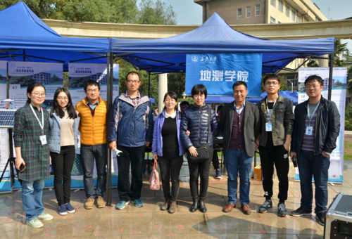 展台展出的作品有“北斗滑坡卫士”、“地空一体化三维实景VR系统”、“一种基于红外感应的精准测绘用三脚架”、“安全人机综合试验仪”等十六个科技创新成果。