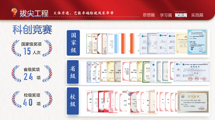 班级开展“拔尖工程”引领并激励每位同学投身于科学探索以及体育竞技之中,致力于科研以及文体素养的全面提升。过去的两年间,科创赛事累计荣获国家级荣誉15人次,如全国大学生测绘学科创新创业智能大赛全国二等奖、第十五届“北斗杯”全国一等奖等。获省级奖项30余项,校级奖项40余项,参与大创项目4项,发表软著一篇。文体活动班级参与率100%,获运动会奖项30余项,文体活动奖项共计50余项。