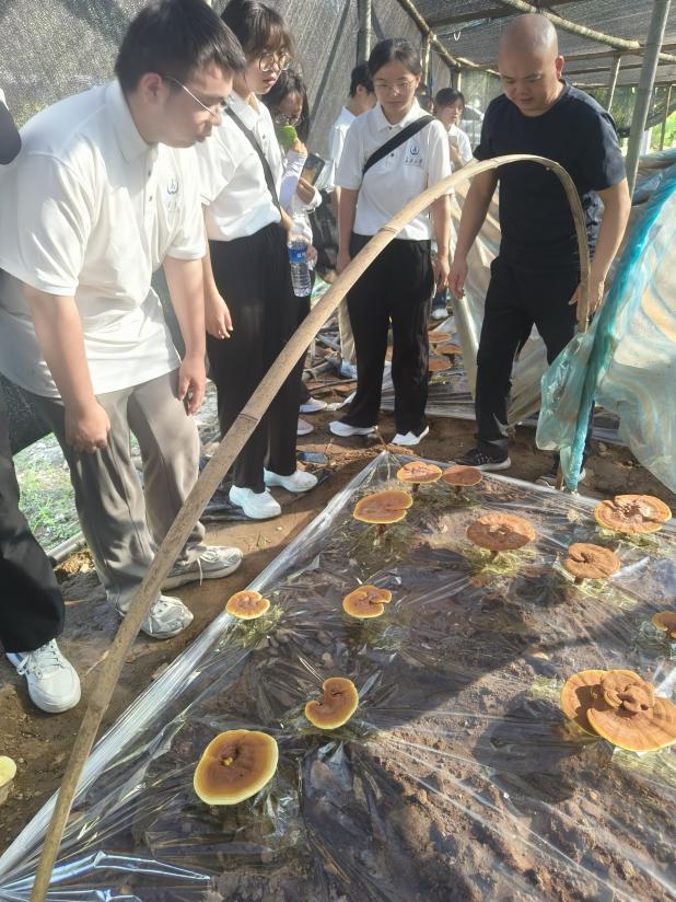 团队首站与青山镇青山绿水现代农业园区负责人魏东座谈,了解菌菇产业发展规划。在他的带领下,团队参观了木耳菌棒加工车间,详细了解菌菇培育至生产包装全流程。魏东阐述了灵芝的“药食同源”价值及精深加工前景,带领团队实地考察灵芝大棚,参观灵芝生长状况,了解灵芝孢子粉生产工艺。