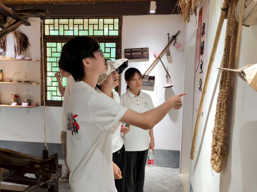 在二郎庙村委会副主任嵇文君的带领下,实践队参观了二郎庙村村史馆,斑驳的老农具、泛黄的照片与干净整洁的小平房,生动呈现了村庄从“贫困村”到“省级美丽宜居示范村”的蜕变历程。随后,队员们走访了依山傍水的特色民宿集群,二郎庙村通过发展特色民宿,不仅带动了当地旅游业的发展,也为村民提供了更多的就业机会和收入来源。