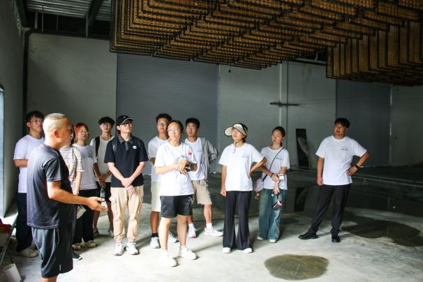 而后,实践队众人在周洋的带领下参观了“东有百亩桃,西有千亩桑”中的桑产业——安康市怡鑫农林综合开发有限公司的生产基地。从千亩桑园的桑叶采摘,到自动化生产出洁白蚕茧;从蚕茧经自动摘茧机分类,到桑枝变废为宝,用作袋料栽培食用菌;工厂未来还计划加工蚕丝被,延伸出桑葚酒加工新环节。该公司构建起了一条从种植农林到加工利用,不断延伸拓展的桑产业发展链,带动着当地经济发展与群众增收致富。