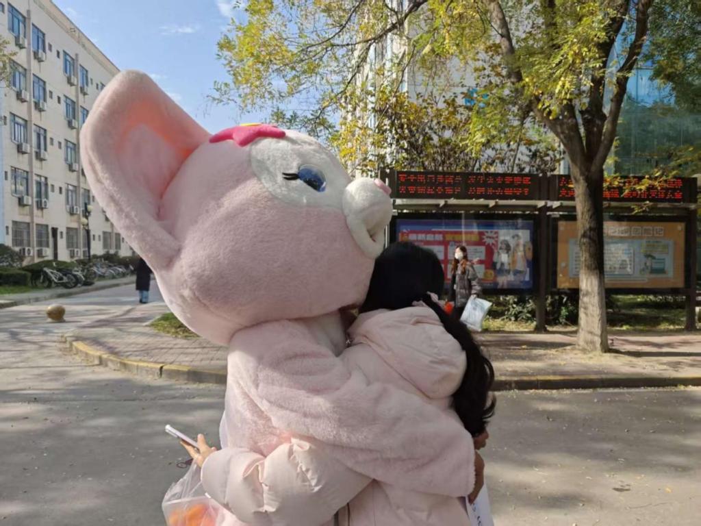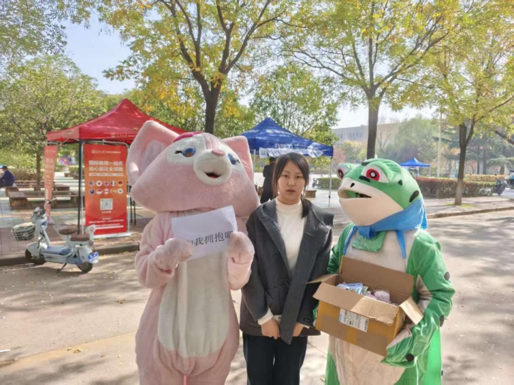 随后,活动进入核心的“自由拥抱”环节。由志愿者们扮演的可爱玩偶“抱抱熊”成为全场焦点,他们手持写有“Free Hugs”、“你今天很棒!”等温暖标语牌,主动向路过的同学们张开双臂。起初有些羞涩的同学们,在轻松愉快的氛围感染下,纷纷停下脚步,与“抱抱熊”热情相拥,现场充满了欢声笑语。