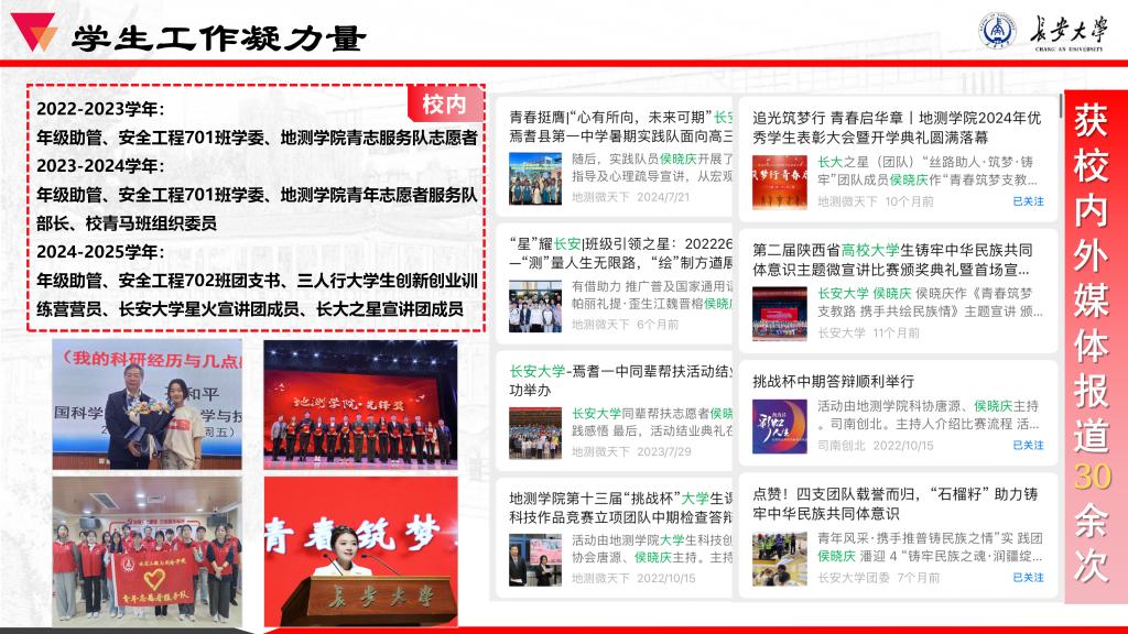 星火宣讲团成员,陕西省铸牢中华民族共同体意宣讲团成员,西北高校青年铸牢中华民族共同体意识宣讲联盟代表。连续三年专业和综合成绩排名双第一,获得国家奖学金、感恩中国近现代科学家奖学金等,现已推免至中国科学技术大学;连续两年赴新疆焉耆开展铸牢中华民族共同体意识社会实践,社会实践时长累计30余天,实践活动被国家级和省部级官方媒体宣传报道80余次,注重凝练总结,将实践案例结合党的创新理论进行宣讲,获得西北高校青年师生铸牢中华民族共同体意识主题演讲比赛三等奖、做爱视频