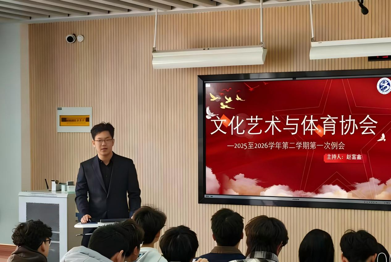文化艺术与体育协会于WX2304教室召开2025-2026学年第二学期首次全体会议。协会指导老师史杨季,主席团潘春霞、肖昱昊、田媛及各部门成员出席会议,共同谋划新学期文体工作。