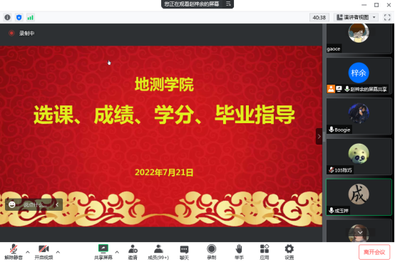 2022年7月21日20:00以腾讯会议的方式召开成绩、选课与毕业指导专题会议。学院教学副院长邵广周,各系副主任成玉祥、纪新林、杨耘、李凯玲老师,教学秘书赵梓余、教务员高策老师及各年级300名学生在线参会。会议由教学秘书赵梓余主持。