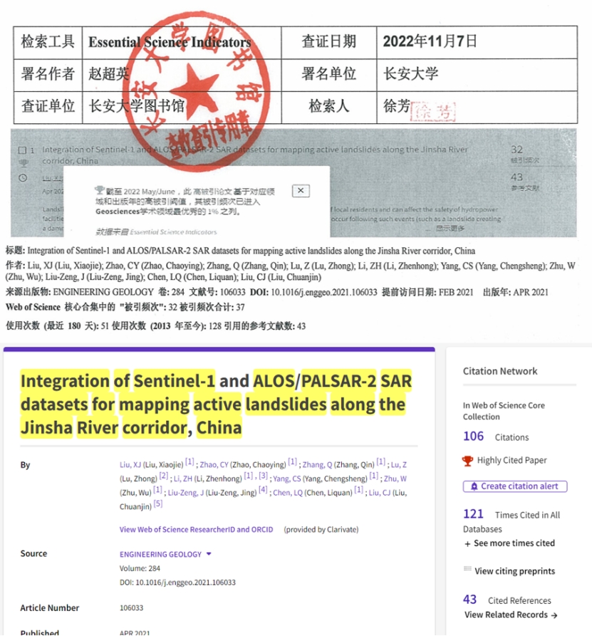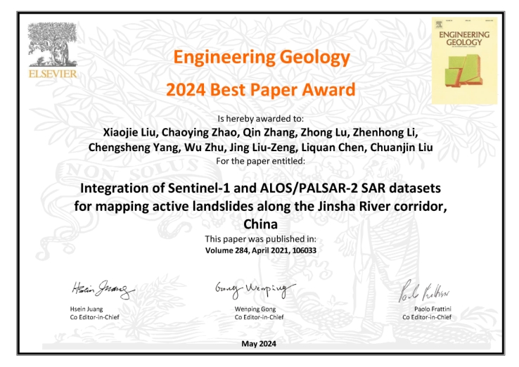 赵超英教授团队的研究成果《Integration of Sentinel-1 and ALOS/PALSAR-2 SAR datasets for mapping active landslides along the Jinsha River corridor, China》榜上有名。该奖项是从2021年至2023年间发表的所有论文中评选而出,经过论文总被引次数初选,主编和编辑团队审议而产生,最终仅有六篇论文入选。