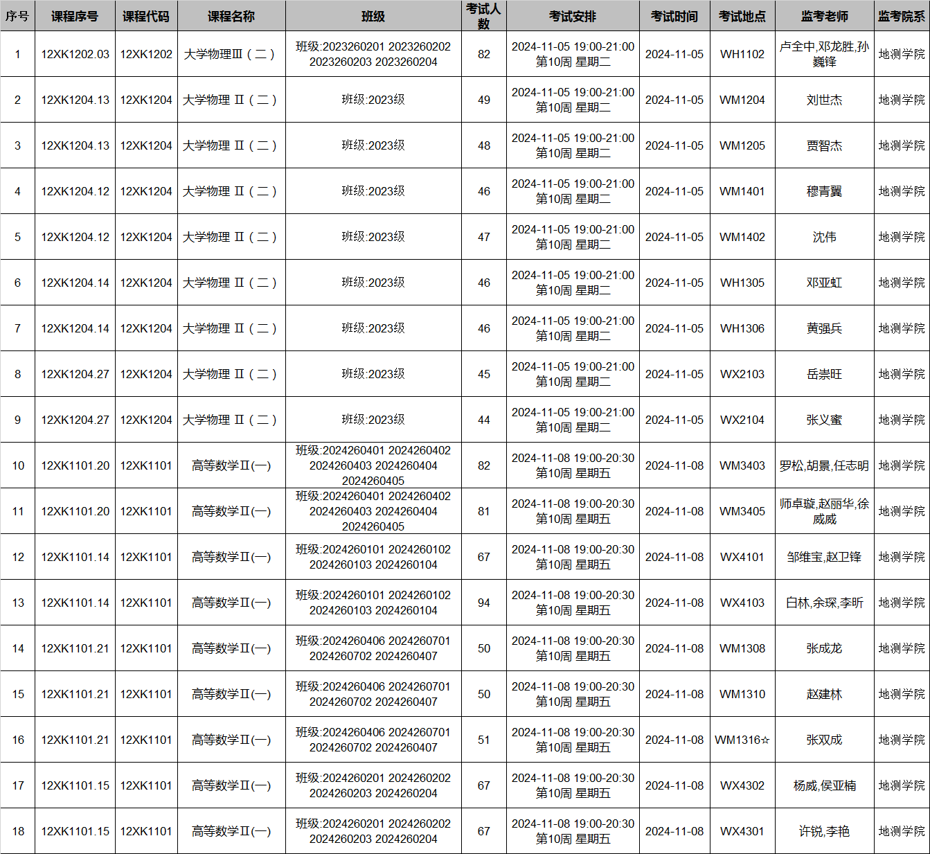 2024-2025-1学期高等数学、大学物理期中考试安排已发布,监考安排学院已经在本科教务系统中填报完成(监考教师可同时在本科教务系统中查看监考安排)。为确保考试平稳顺利进行,学院已将相关监考工作安排表格上传到附件中,请各位老师及时下载查阅,并按时完成监考工作。