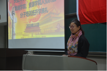 随后培训班班主任段少帅宣读《入党积极分子培训班课程安排》,班主任谢楠宣布《入党积极分子考核规定》。在学员代表任旭晨同学发言之后,资源学院党委副书记荆琳讲话。她表示入党积极分子应从思想上真正入党,在今后的学习生活中时刻规范自己的行为。讲话的最后,荆琳副书记表示,希望同学们通过本次培训能进一步学习党的知识,进一步端正入党动机,明确入党目的,经受党组织的考验。